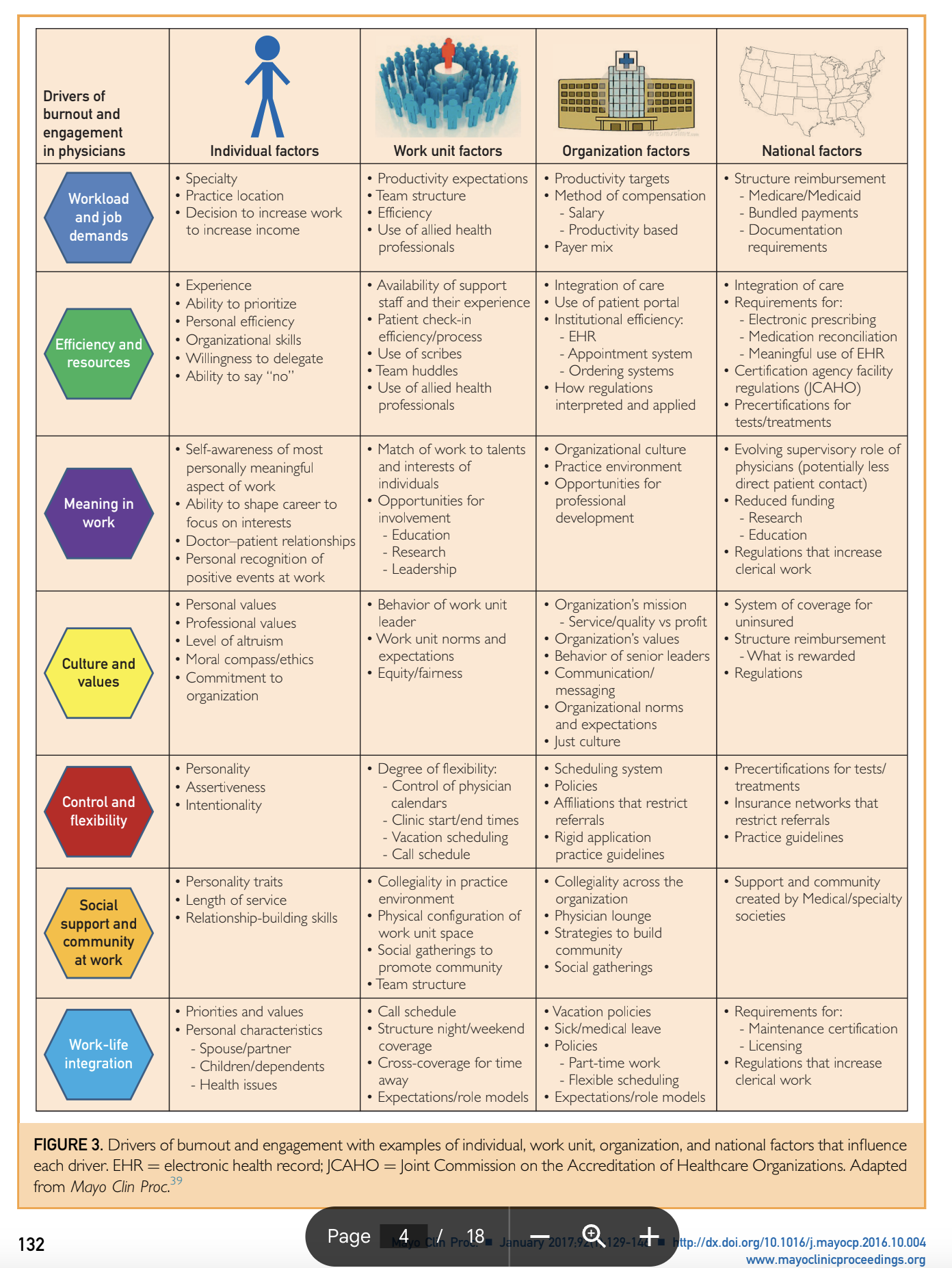 I recently dove into the literature around physician burnout.  The Mayo Clinic has been doing thoughtful research on the topic for a number of years.  Here’s a graphic showing the drivers of burnout in physicians, and assigning responsibility for those factors to individuals, work units/teams, organizations, and national factors: